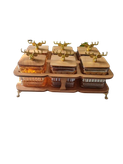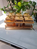 ظروف بلور با کیفیت: شامل ۴ ظرف بلور عسلی با درب چوبی و دستگیره طلایی شاخ گوزنی 🦌، مناسب سرو آجیل، خشکبار، شکلات و تنقلات.