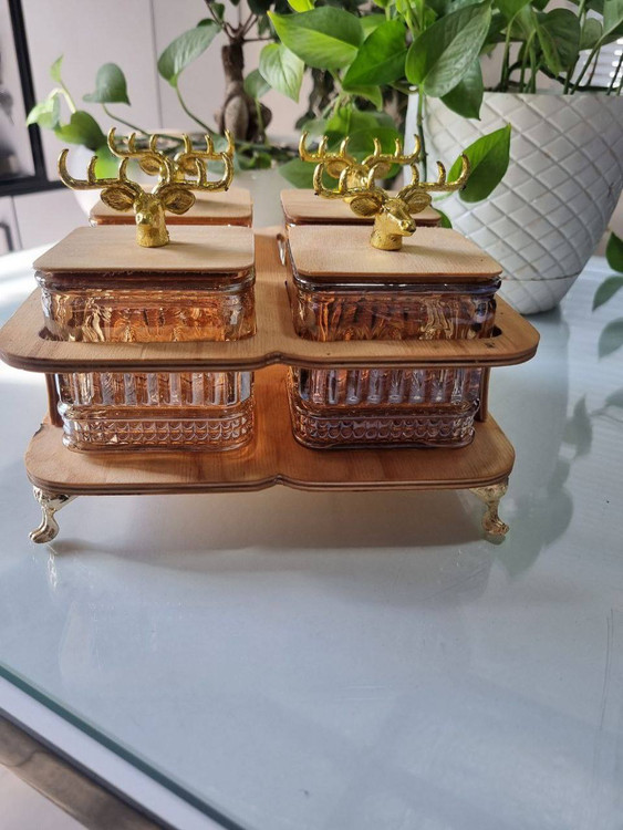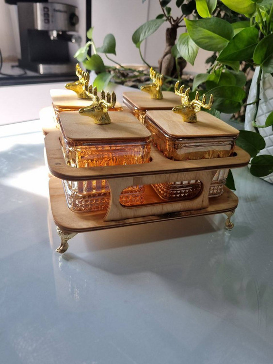 اردوخوریهای لوکس: چهار ظرف بلور عسلی با درب چوبی و دستگیره طلایی شاخ گوزنی 🦌، ایدهآل برای سرو آجیل، خشکبار و شکلات در مهمانیها.