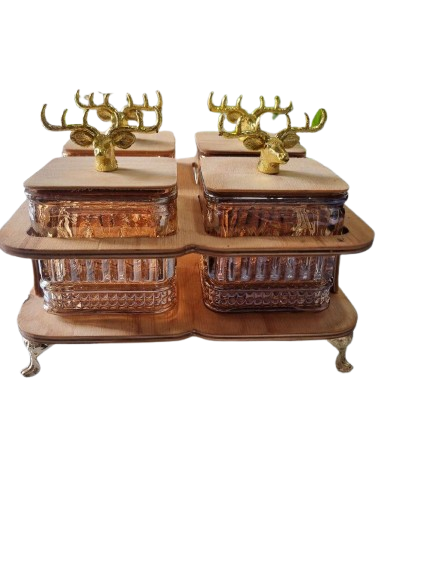 ست پذیرایی ۴ تکه چوب و بلور عسلی – اردوخوری لوکس آجیل و شکلات با درب چوبی